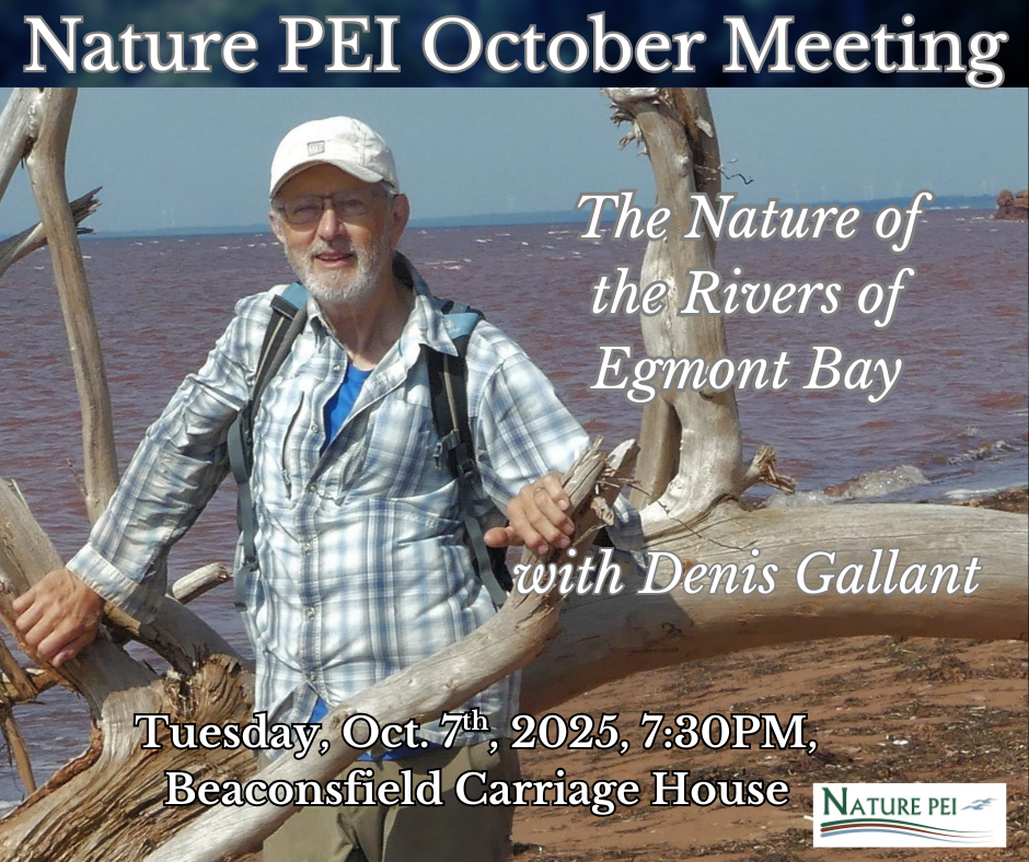 From October to June, Nature PEI (the Natural History Society of Prince Edward Island) meets on the first Tuesday at 7:30PM to share current sightings and enjoy a unique presentation on a natural history-related topic. The NEXT MEETING is Tuesday, October 7th, 2025, with Denis Gallant on THE NATURE OF THE RIVERS OF EGMONT BAY; the presentation starts at 8PM. More details at our Calendar of Events.