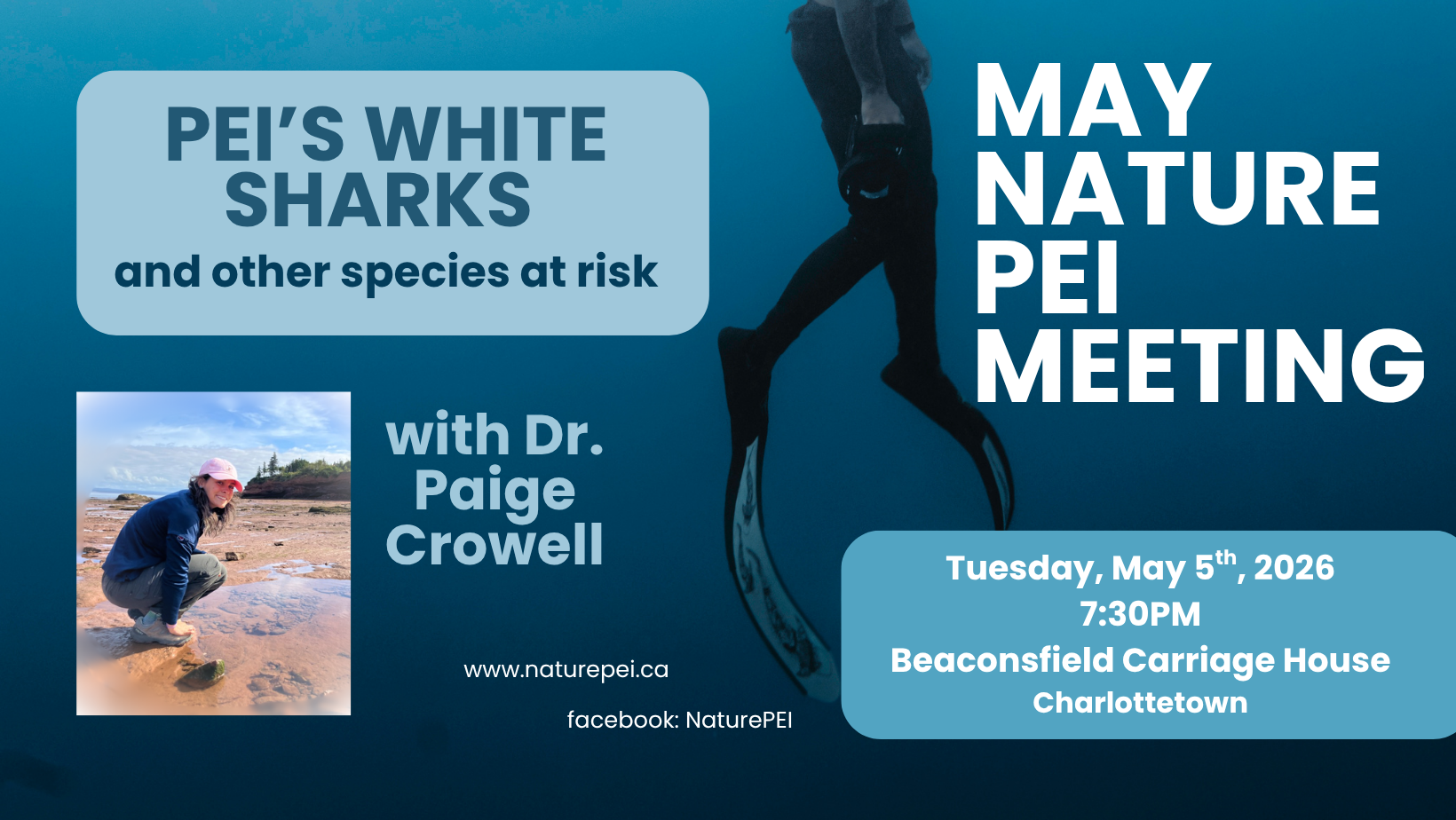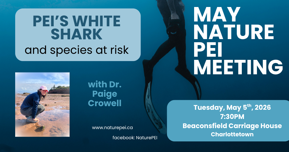 From October to June, Nature PEI (the Natural History Society of Prince Edward Island) meets on the first Tuesday at 7:30PM to share current sightings and enjoy a unique presentation on a natural history-related topic. Tuesday, May 5th, biologist Paige Crowell will share photos and information about PEI's sharks and aquatic species-at-risk. The meeting starts at 7:30PM at Beaconsfield Carriage House, corner of West and Kent Streets in Charlottetown. Free and all welcome! More details at our Calendar of Events.