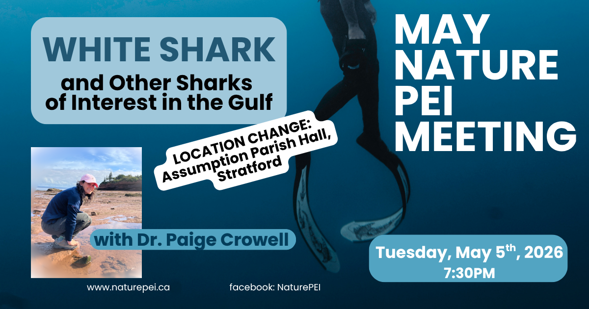 From October to June, Nature PEI (the Natural History Society of Prince Edward Island) meets on the first Tuesday at 7:30PM to share current sightings and enjoy a unique presentation on a natural history-related topic. Tuesday, May 5th, biologist Paige Crowell will share photos and information about PEI's white shark and some species at risk. The meeting starts at 7:30PM at Beaconsfield Carriage House, corner of West and Kent Streets in Charlottetown. Free and all welcome! More details at our Calendar of Events.