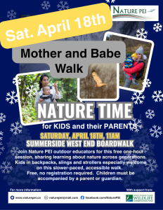 Parents and kids of all ages are welcome to attend Saturday morning outdoor nature time programming in Summerside. These free one hour events are hosted by Nature PEI and are open to parents and children of all ages.