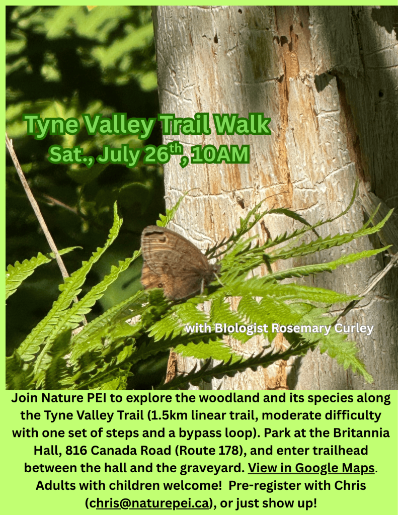 Rosemary Curley is leading a nature walk at the Tyne Valley Trail on Saturday, July 26th, 10AM-12noon, to explore the woodland and its species along the Tyne Valley Trail (1.5km linear trail with one set of steps and a bypass loop) . Park at the Britannia Hall, 816 Canada Road, and enter trailhead between the hall and the graveyard. (Moderate difficulty, but we may use the bypass loop) Adults with children welcome!