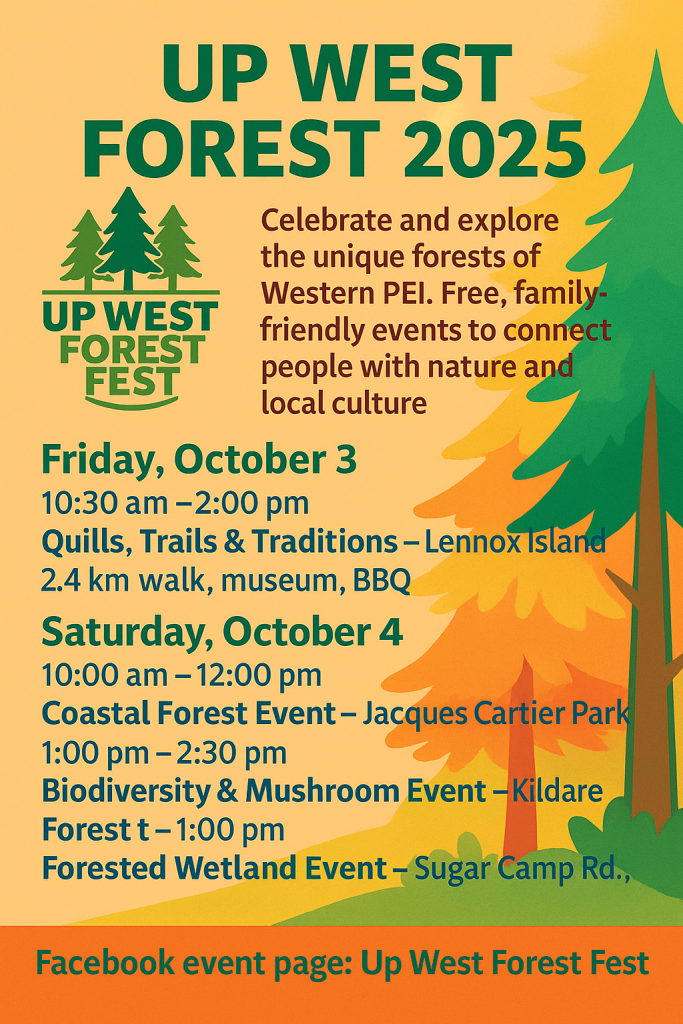 We’re excited to invite you to the inaugural Up West Forest Fest. Join us for free, family-friendly events that celebrate the ecological and cultural importance of Western PEI’s forests.